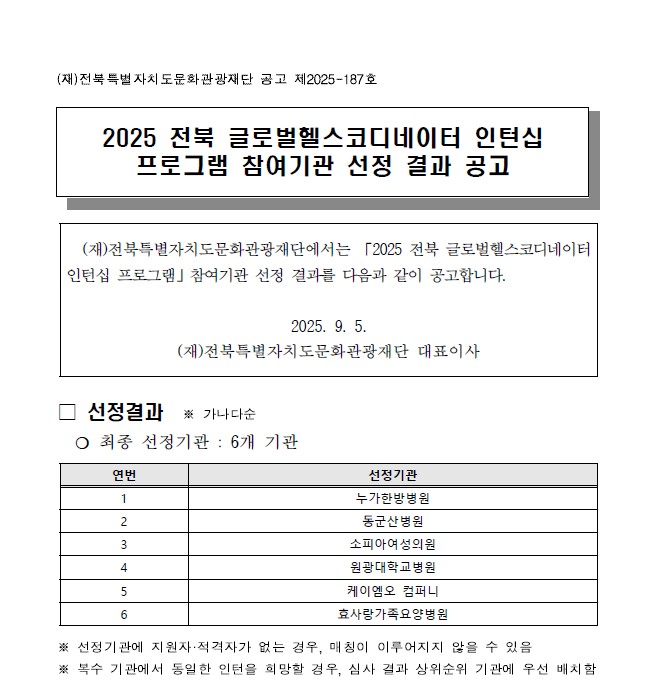 2025 전북 글로벌헬스코디네이터 인턴십 프로그램 참여기관 선정 결과 공고문