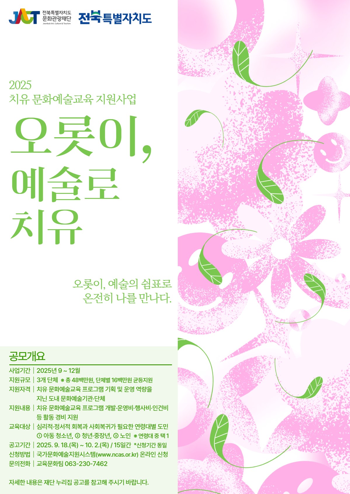 전북특별자치도문화관광재단(대표이사 이경윤, 이하 재단)은 오는 9월 18일부터 10월 2일까지 2025 치유 문화예술교육 지원사업인 ‘오롯이, 예술로 치유’를 공모한다.