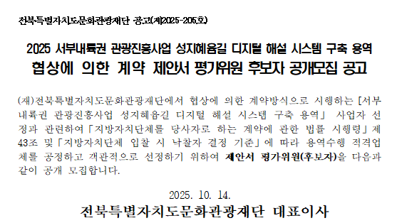 2025 서부내륙권 관광진흥사업 성지혜윰길 디지털 해설 시스템 구축 용역 제안서 평가위원 후보자 공개모집