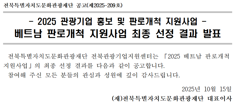 2025 관광기업 홍보 및 판로개척 지원사업 「베트남 판로개척 지원사업」최종선정 결과발표