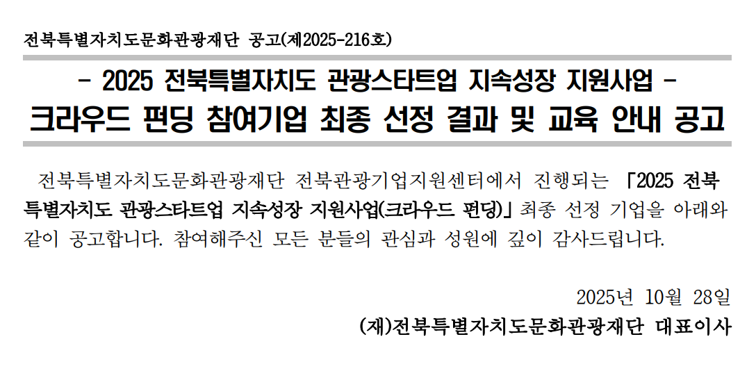 2025 전북특별자치도 관광스타트업 지속성장 지원사업 크라우드 펀딩 참여기업 최종 선정 결과