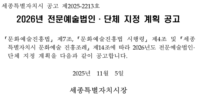 [세종시청] 2026년 전문예술법인·단체 지정 계획 공고