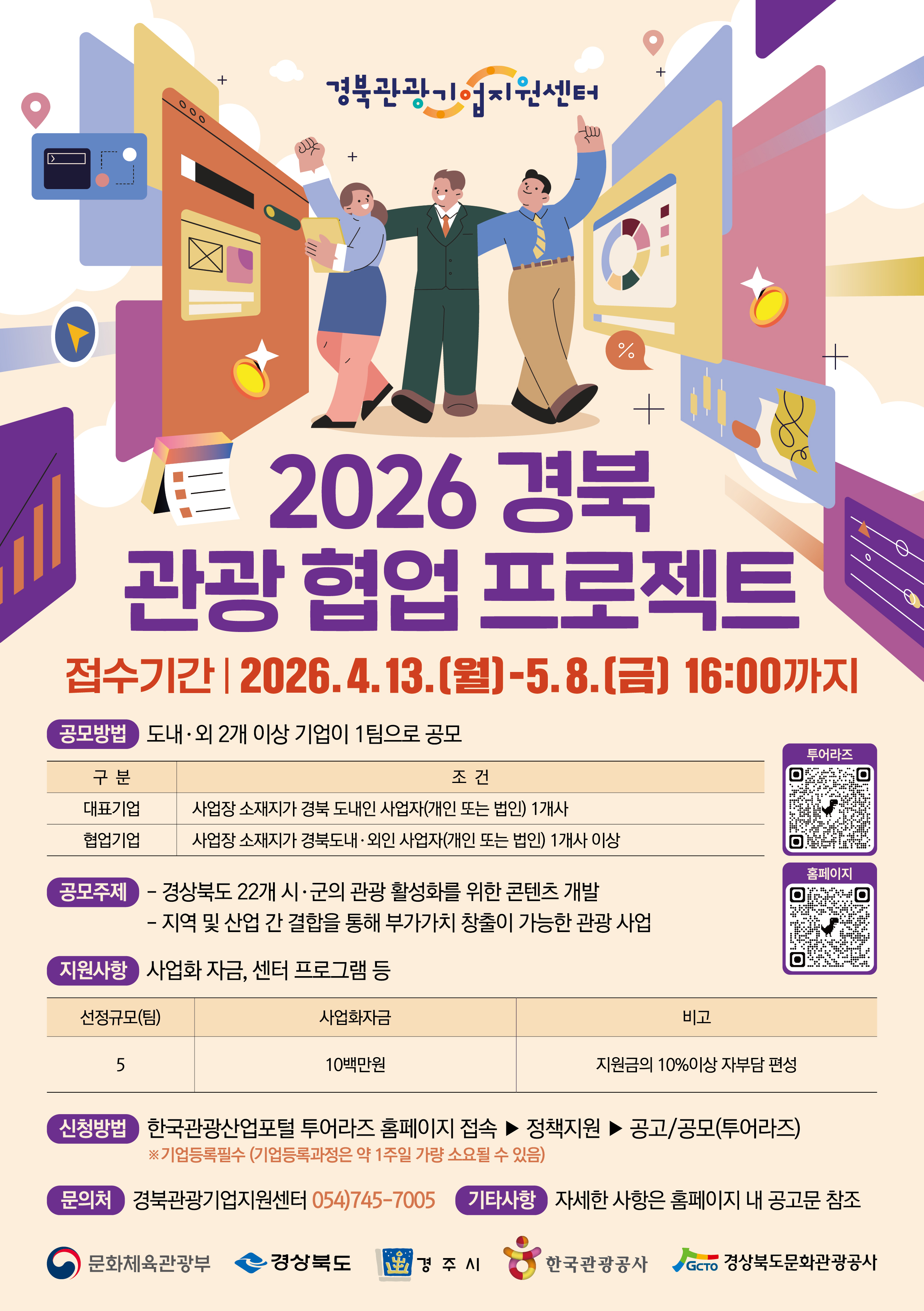 경상북도문화관광공사에서는 관광기업 간 협업을 통해 지역 관광자원을 연계하고 새로운 관광 상품 발굴하고자「2026 경북 관광 협업 프로젝트」를 실시하오니 많은 참여 바랍니다.