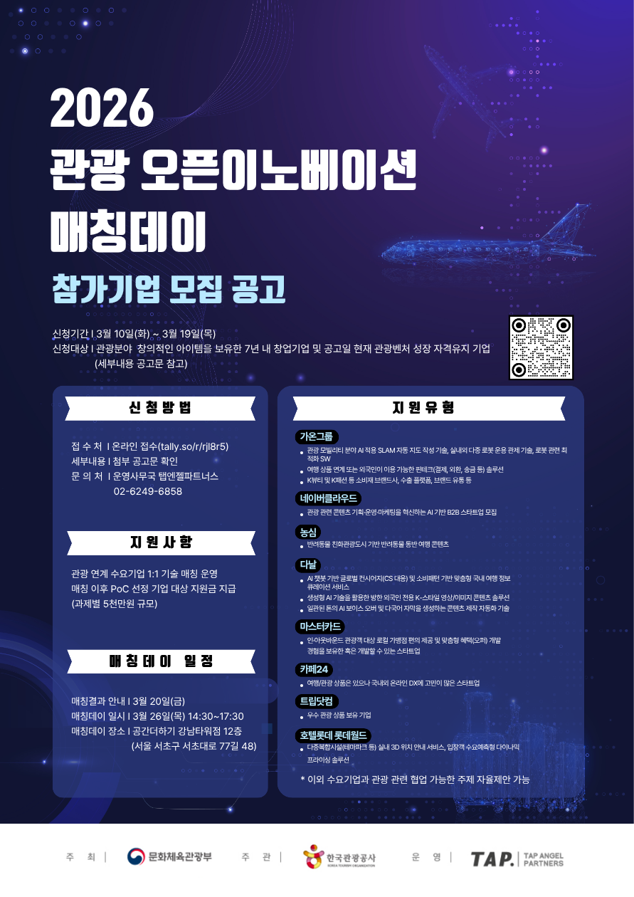 - 지원사항: 관광 연계 수요기업 1:1 기술 매칭 운영, 매칭 이후 PoC 선정 기업 대상 지원금 지급(과제별 5천만원 규모)