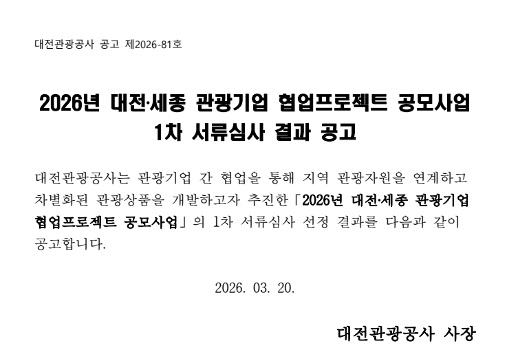 2026년 대전·세종 관광기업 협업프로젝트 공모사업 1차 서류심사 결과 공고