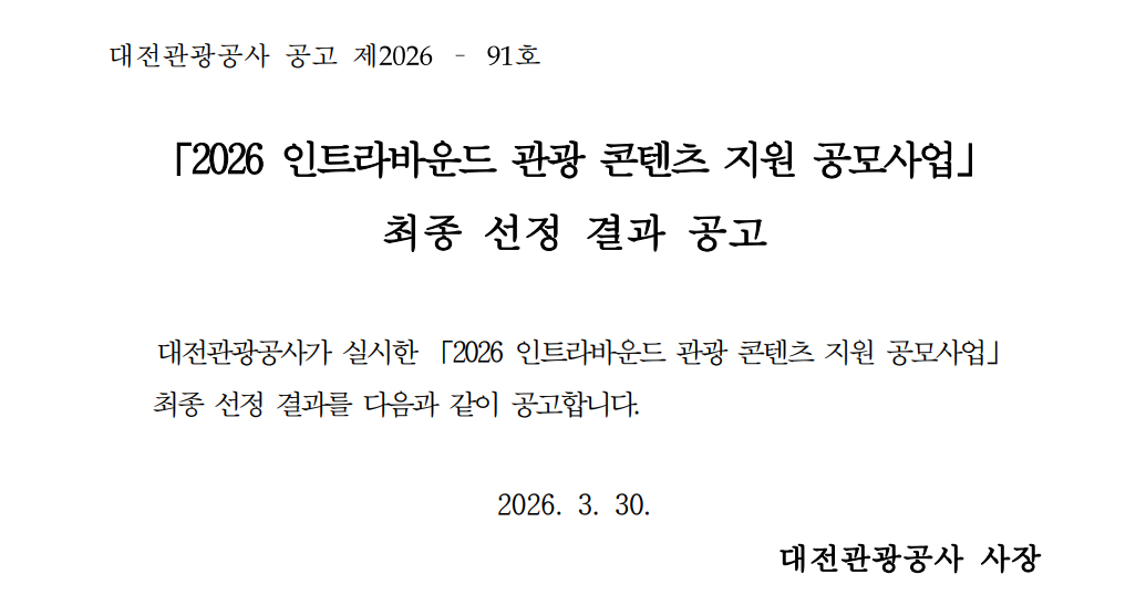 2026 인트라바운드 관광 콘텐츠 지원 공모사업 최종 선정 결과 공고