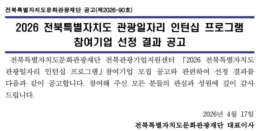 2026 전북특별자치도 관광일자리 인턴십 프로그램 참여기업 선정결과 공고