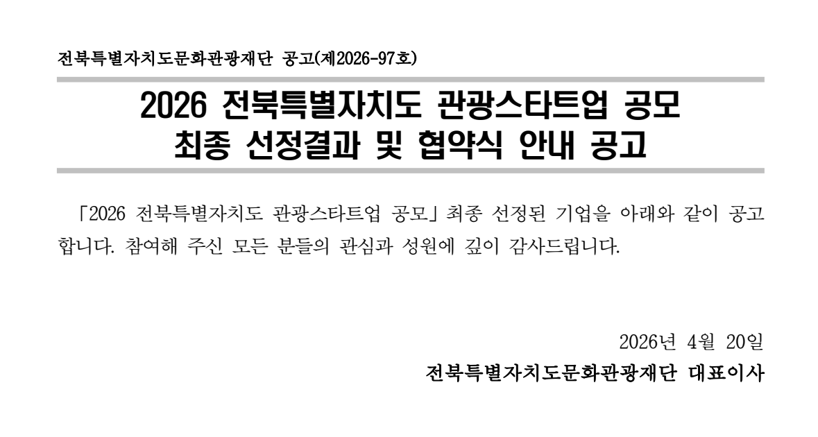2026 전북특별자치도 관광스타트업 공모 최종 선정결과 및 협약식 안내 공고