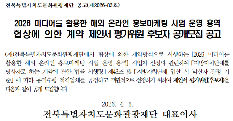 2026 미디어를 활용한 해외 온라인 홍보마케팅 사업 운영 용역 제안서 평가위원 구성 및 공개모집 공고